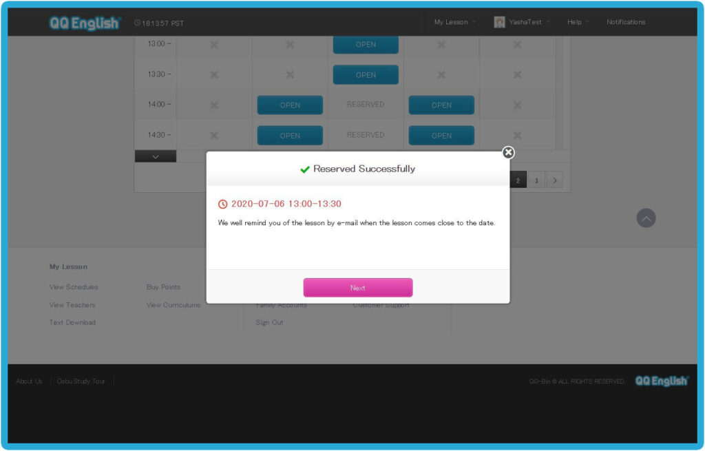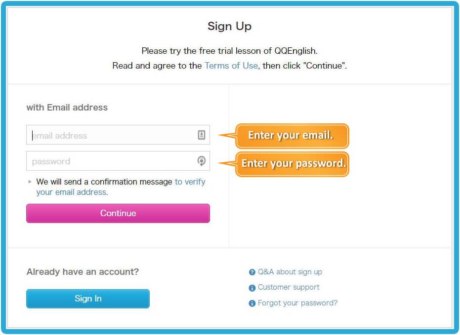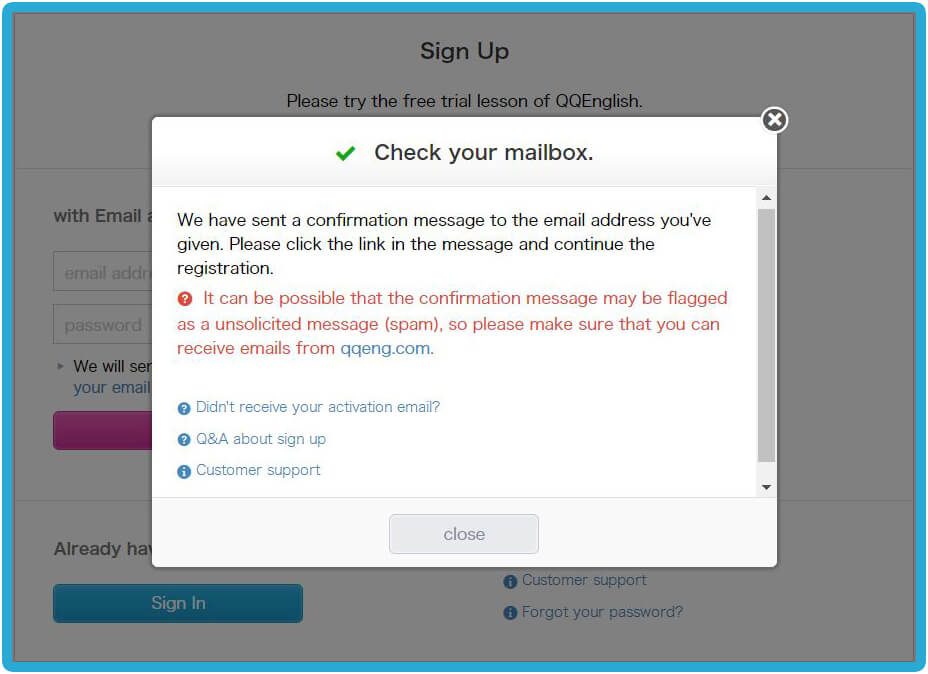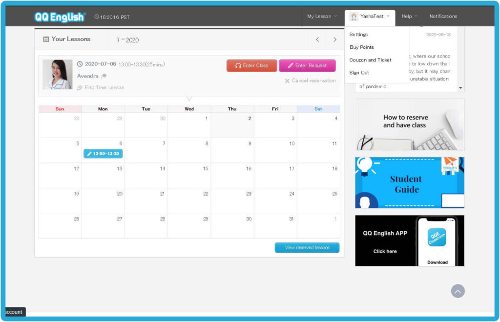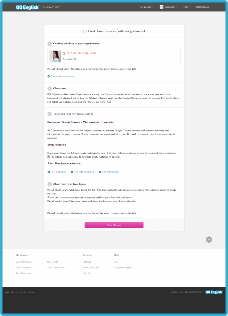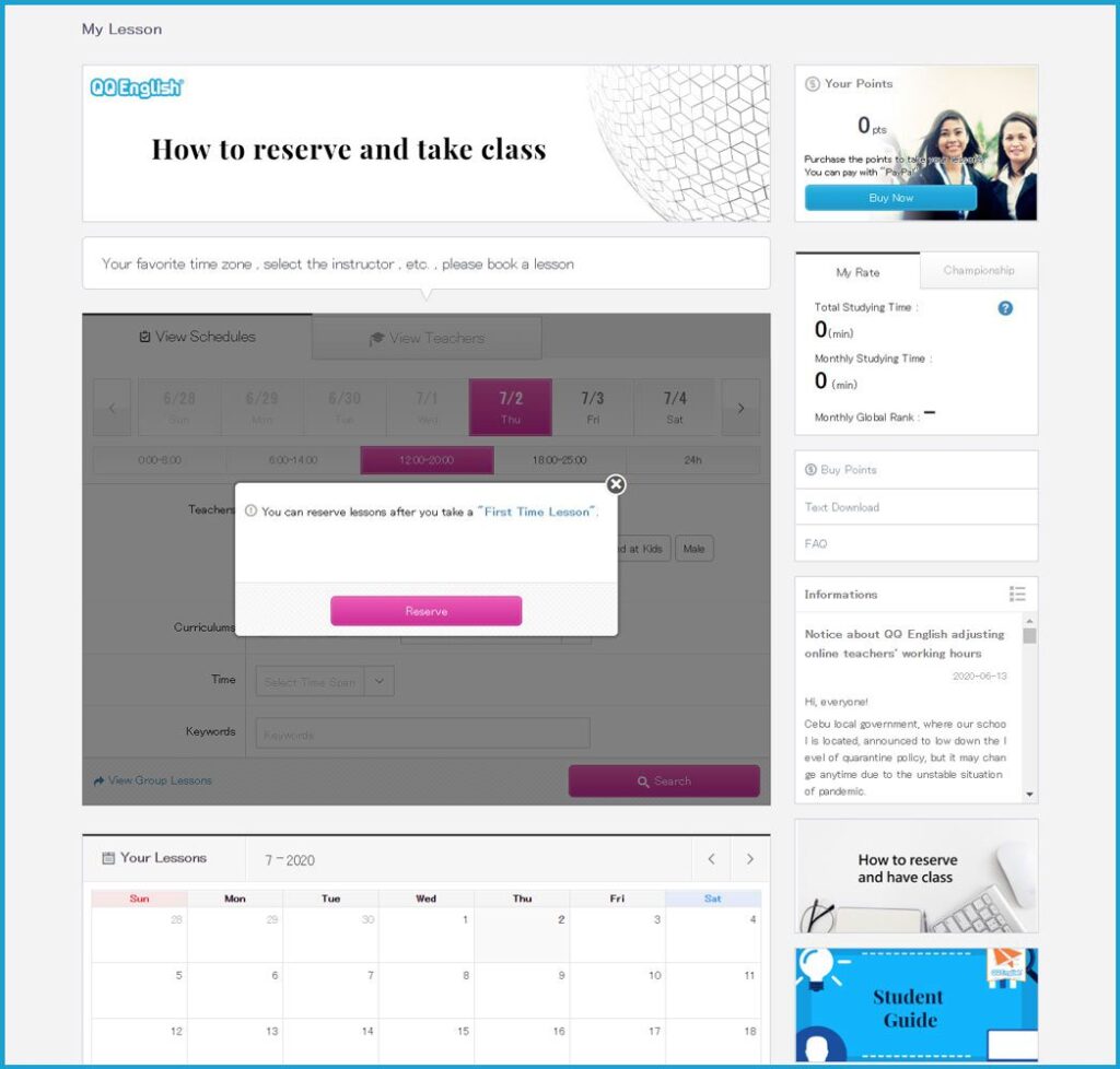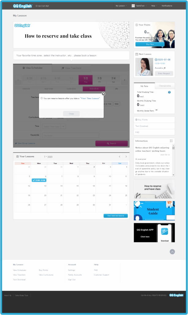 Home - 如何開始你的線上英文課程 如何開始你的線上英文課程 如何開始你的線上英文課程 如何註冊 1. 請點擊右方的「註冊」按鈕,免費體驗線上課程 → 免費註冊 2. 請輸入您的有效電子信箱以接收確認郵件3. 請設置您 QQEnglish 帳戶的密碼4. 請點擊「繼續」以便收到郵件 5. 請至您的電子信箱收取確認郵件6. 請點擊「關閉」按鈕至您的電子信箱收取QQEnglish的確認郵件( Gmail, Yahoo mail 或其他有效電子信箱…)注意:* 您需要使用有效的電子信箱進行註冊* 請確保您的電子信箱沒有被註冊過 7. 請查收來自noreaply@notify.qqeng.com 的郵件8. 請點擊郵件中的確認連結*如果您無法收取確認郵件*郵件可能被標記為未經請求的郵件(垃圾郵件) 9. 請填寫表格中的必填內容 10. 恭喜您!您成功註冊專屬學生帳戶,請點擊 「下一步」 如何檢測您的上課設備是否正常? 1. 在開始測試之前,請確保您使用的是Google Chrome瀏覽器 2. 請點擊「下一步」按鈕以檢查您的網路 3. 請點擊「開始測試」按鈕 4. 請繼續點擊「下一步」按鈕 5. 請點擊「允許」按鈕開啟系統使用攝像鏡頭的權限 6. 成功檢查攝像鏡頭後請點擊「下一步」按鈕 7. 接著,點擊「允許」開啟系統使用麥克風的權限 8. 成功檢查完麥克風後,請點擊「下一步」 9. 測試您的麥克風請嘗試說話,並確保您能聽到聲音 10. 所有設備都測試通過後,就可以開始上課 如何預約第一次程度測驗課程? 1. 點擊「登入」按鈕以登入網站 →* 請使用 Google Chrome 瀏覽器 登入 2. 請點擊「預約」按鈕 3. 選擇課程的「日期」和「時間」4. 點擊「搜尋」按鈕 5. 選擇您的老師,然後點擊「預約」預約課程 6. 請點擊“預約”按鈕. 7. 點擊“下一步”預覽要使用的教材. 8. 請確認課程的詳細資訊. 9. 您可以在學生頁面中的日曆表看到您的課程. 如何上課? 1. 登入網頁進入課程 登入 2. 您可以點擊頂部欄單中您的“ 姓名 ”,查看其他功能. 3. 查看日曆上的已預約課程.4. 點擊您的課程,然後點擊“進入教室”按鈕進入教室.您可以在課程開始前5分鐘內進入教室,然後等待您的老師出現.