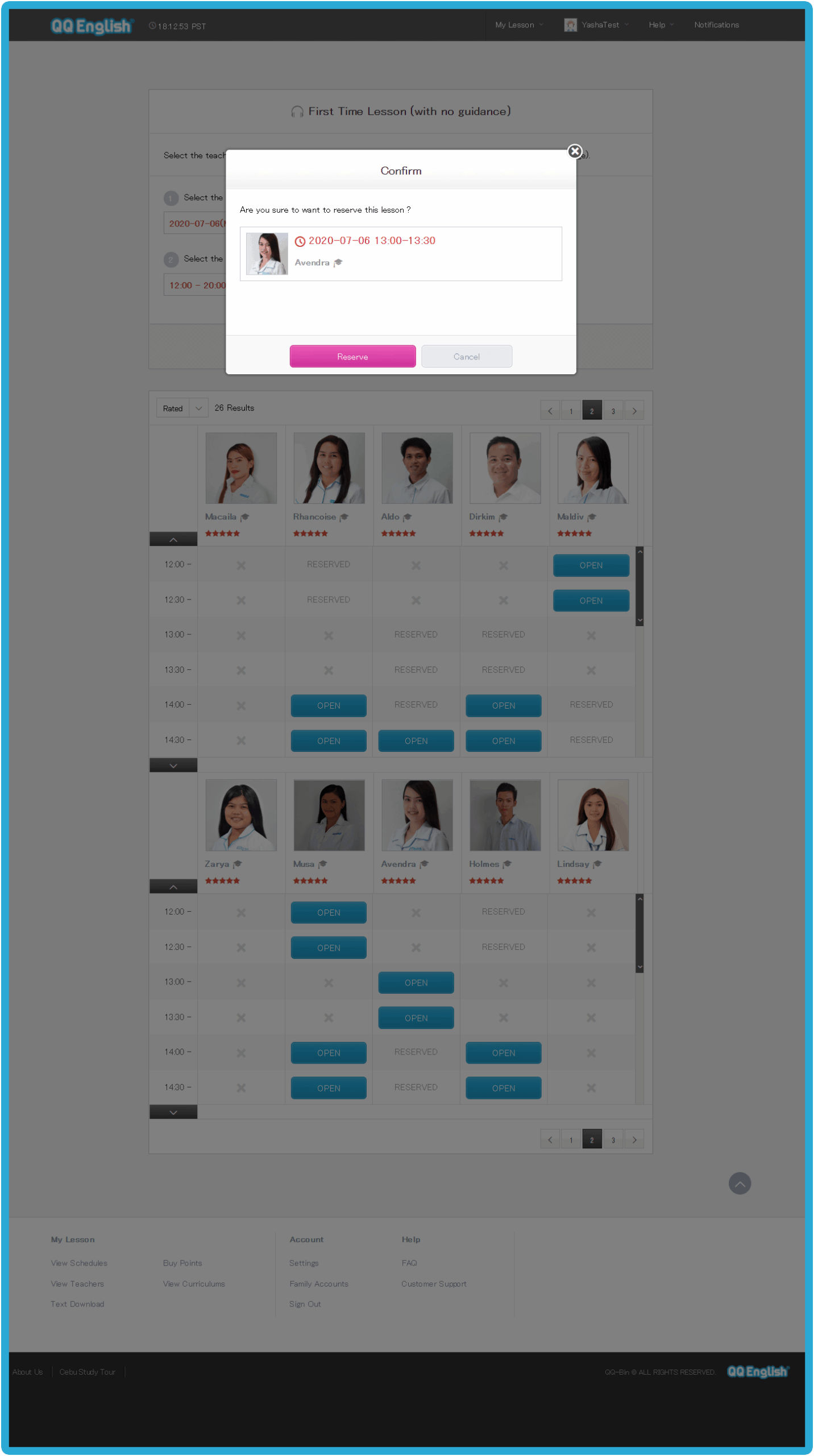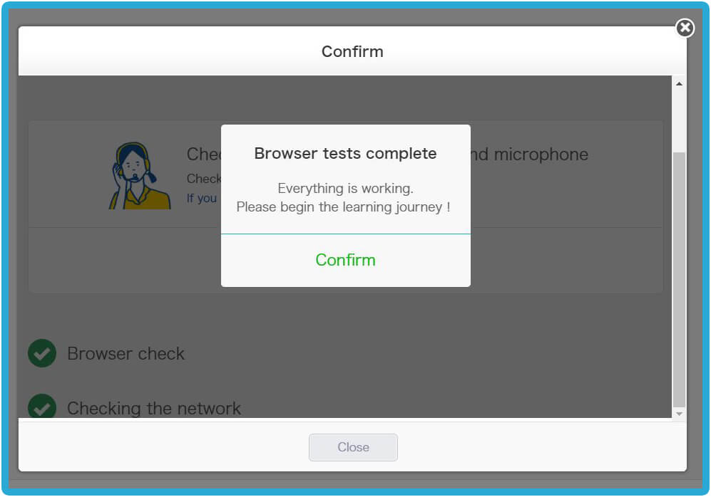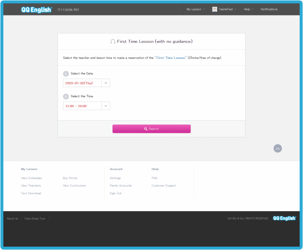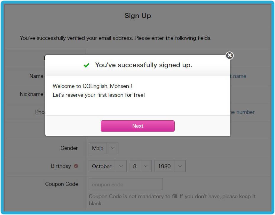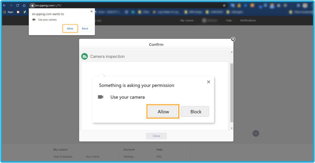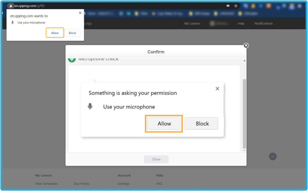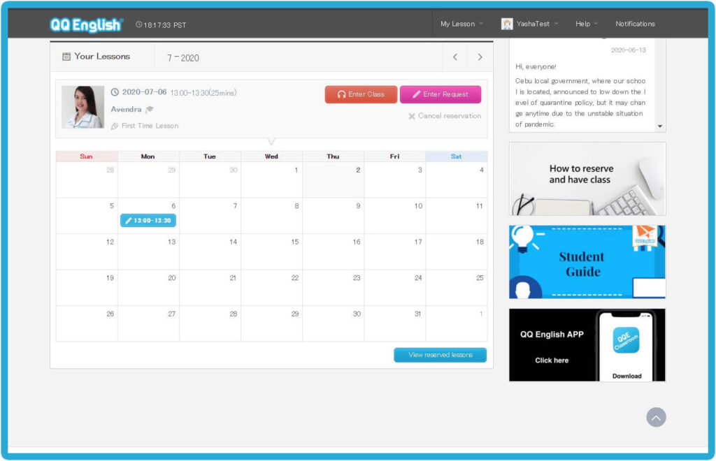 Home - 如何開始你的線上英文課程 如何開始你的線上英文課程 如何開始你的線上英文課程 如何註冊 1. 請點擊右方的「註冊」按鈕,免費體驗線上課程 → 免費註冊 2. 請輸入您的有效電子信箱以接收確認郵件3. 請設置您 QQEnglish 帳戶的密碼4. 請點擊「繼續」以便收到郵件 5. 請至您的電子信箱收取確認郵件6. 請點擊「關閉」按鈕至您的電子信箱收取QQEnglish的確認郵件( Gmail, Yahoo mail 或其他有效電子信箱…)注意:* 您需要使用有效的電子信箱進行註冊* 請確保您的電子信箱沒有被註冊過 7. 請查收來自noreaply@notify.qqeng.com 的郵件8. 請點擊郵件中的確認連結*如果您無法收取確認郵件*郵件可能被標記為未經請求的郵件(垃圾郵件) 9. 請填寫表格中的必填內容 10. 恭喜您!您成功註冊專屬學生帳戶,請點擊 「下一步」 如何檢測您的上課設備是否正常? 1. 在開始測試之前,請確保您使用的是Google Chrome瀏覽器 2. 請點擊「下一步」按鈕以檢查您的網路 3. 請點擊「開始測試」按鈕 4. 請繼續點擊「下一步」按鈕 5. 請點擊「允許」按鈕開啟系統使用攝像鏡頭的權限 6. 成功檢查攝像鏡頭後請點擊「下一步」按鈕 7. 接著,點擊「允許」開啟系統使用麥克風的權限 8. 成功檢查完麥克風後,請點擊「下一步」 9. 測試您的麥克風請嘗試說話,並確保您能聽到聲音 10. 所有設備都測試通過後,就可以開始上課 如何預約第一次程度測驗課程? 1. 點擊「登入」按鈕以登入網站 →* 請使用 Google Chrome 瀏覽器 登入 2. 請點擊「預約」按鈕 3. 選擇課程的「日期」和「時間」4. 點擊「搜尋」按鈕 5. 選擇您的老師,然後點擊「預約」預約課程 6. 請點擊“預約”按鈕. 7. 點擊“下一步”預覽要使用的教材. 8. 請確認課程的詳細資訊. 9. 您可以在學生頁面中的日曆表看到您的課程. 如何上課? 1. 登入網頁進入課程 登入 2. 您可以點擊頂部欄單中您的“ 姓名 ”,查看其他功能. 3. 查看日曆上的已預約課程.4. 點擊您的課程,然後點擊“進入教室”按鈕進入教室.您可以在課程開始前5分鐘內進入教室,然後等待您的老師出現.